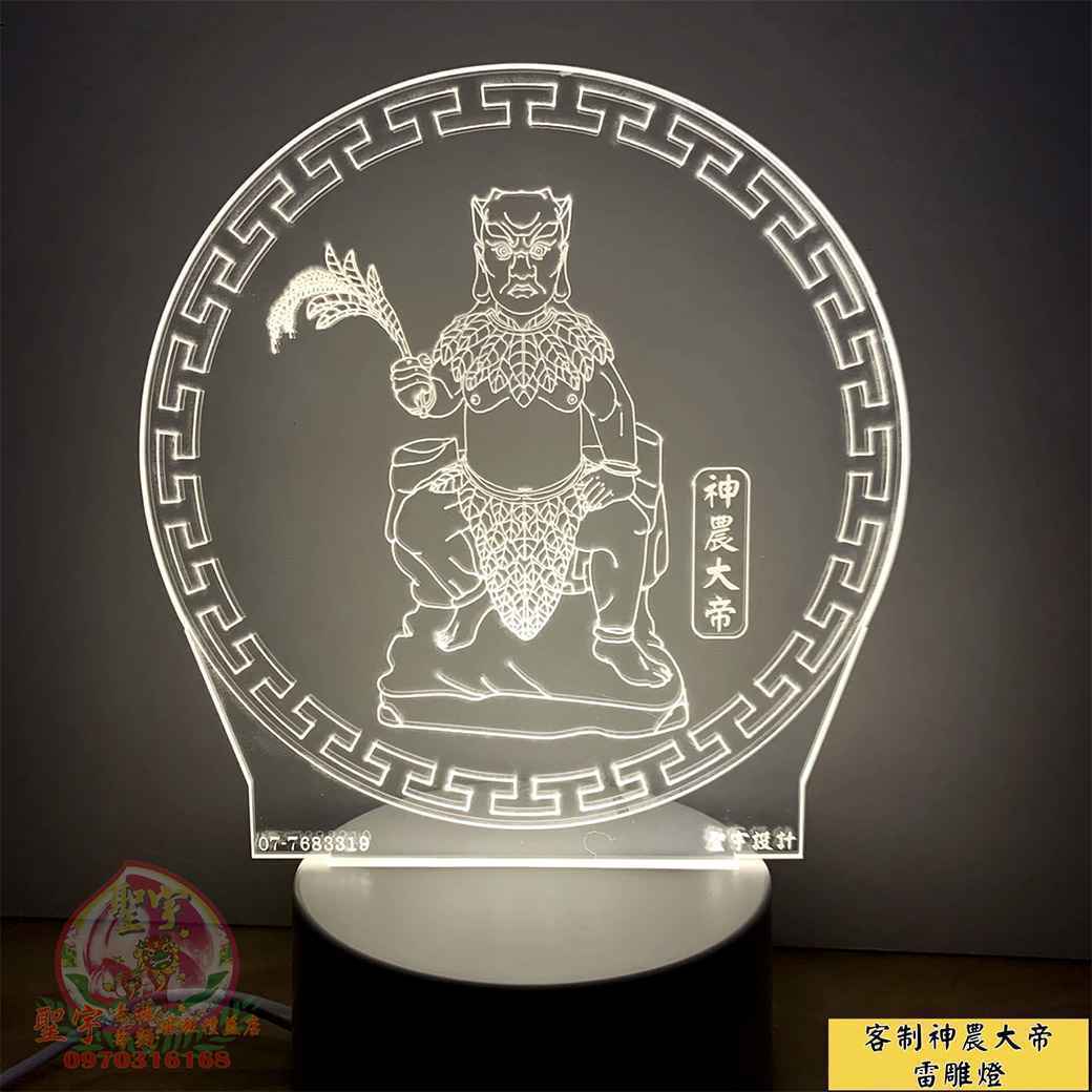 史籍記載神農嚐百草發現五穀、藥草,並發明農器教民耕種,因此被視為農業及醫藥界的始祖和守護神。 神農大帝造型為上身赤膊、以樹葉為衣裳,傳說其為「牛首人身」,故頭上還有兩個犄角。