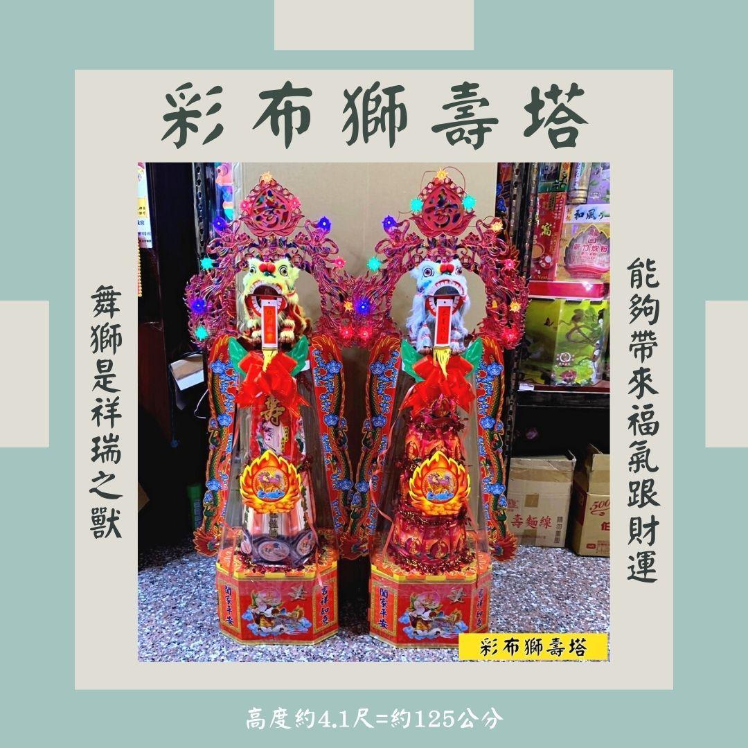 (壽桃塔是採用一邊壽桃,一邊壽麵 來敬拜答謝神明, 且上面的吉祥物飾品各有代表不同的含意 讓您祈求來年能夠 招財進寶,平安順遂)