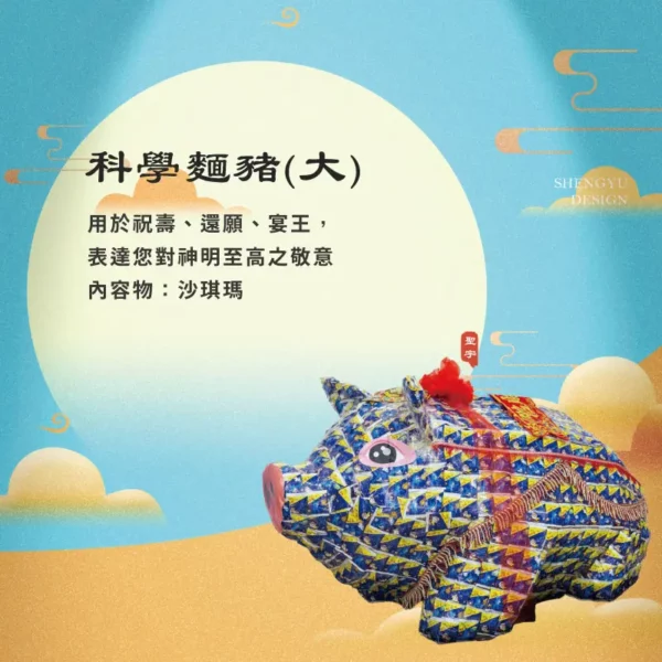 商品特色:用科學麵製作成豬造型,殺豬宰羊供俸神明,表達最高心意
