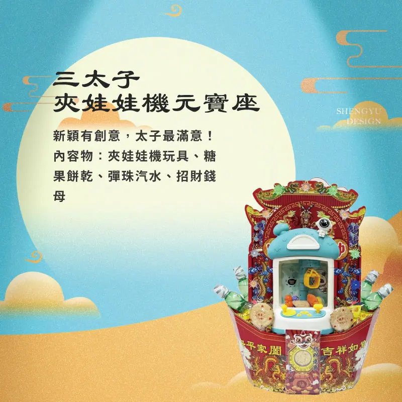 商品內容物:夾娃娃機玩具、餅乾、飲料、招財錢母