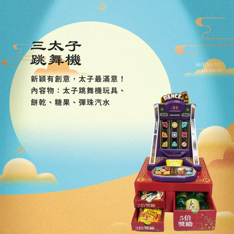 商品內容:三太子跳舞機玩具、彈珠汽水、糖果、餅乾